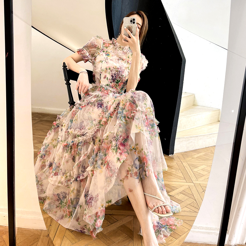Diamond Embroidered Chiffon Dress With Summer Lotus Sleeves