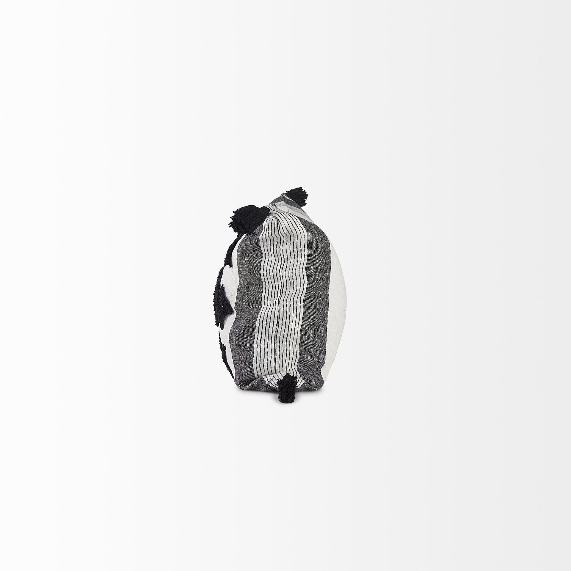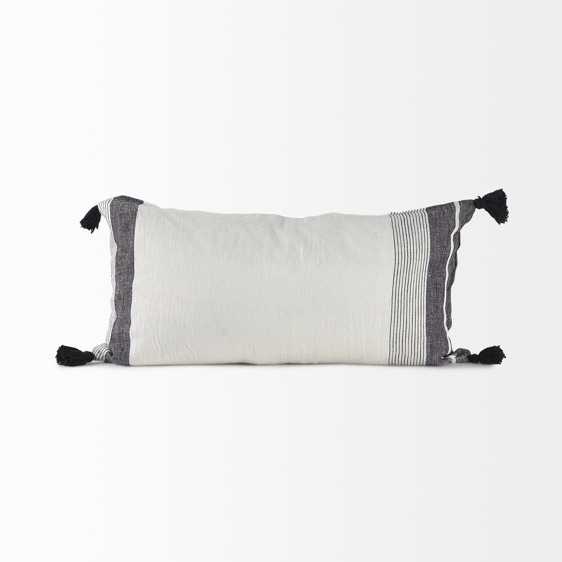 With this White and Gray Fringed Lumbar Pillow Cover you can add the perfect finishing touch to your couch. This Pillow cover is made highly durable and soft linen material that provides comfort beyond measure. The Pillow cover has a white background with gray and striped vertical lines on either edge. On top of the white background there is a black textured chevron pattern which matches the black tassles on all four corners. The back has a zip closure that ensures your Pillow stays in there securely. The neutral color palette will look great on top of any couch, bed or chair you have and go with any interior style you have in your home. This Pillow cover is also great for extra back support. 1″ H x 26″ W x 14″ D